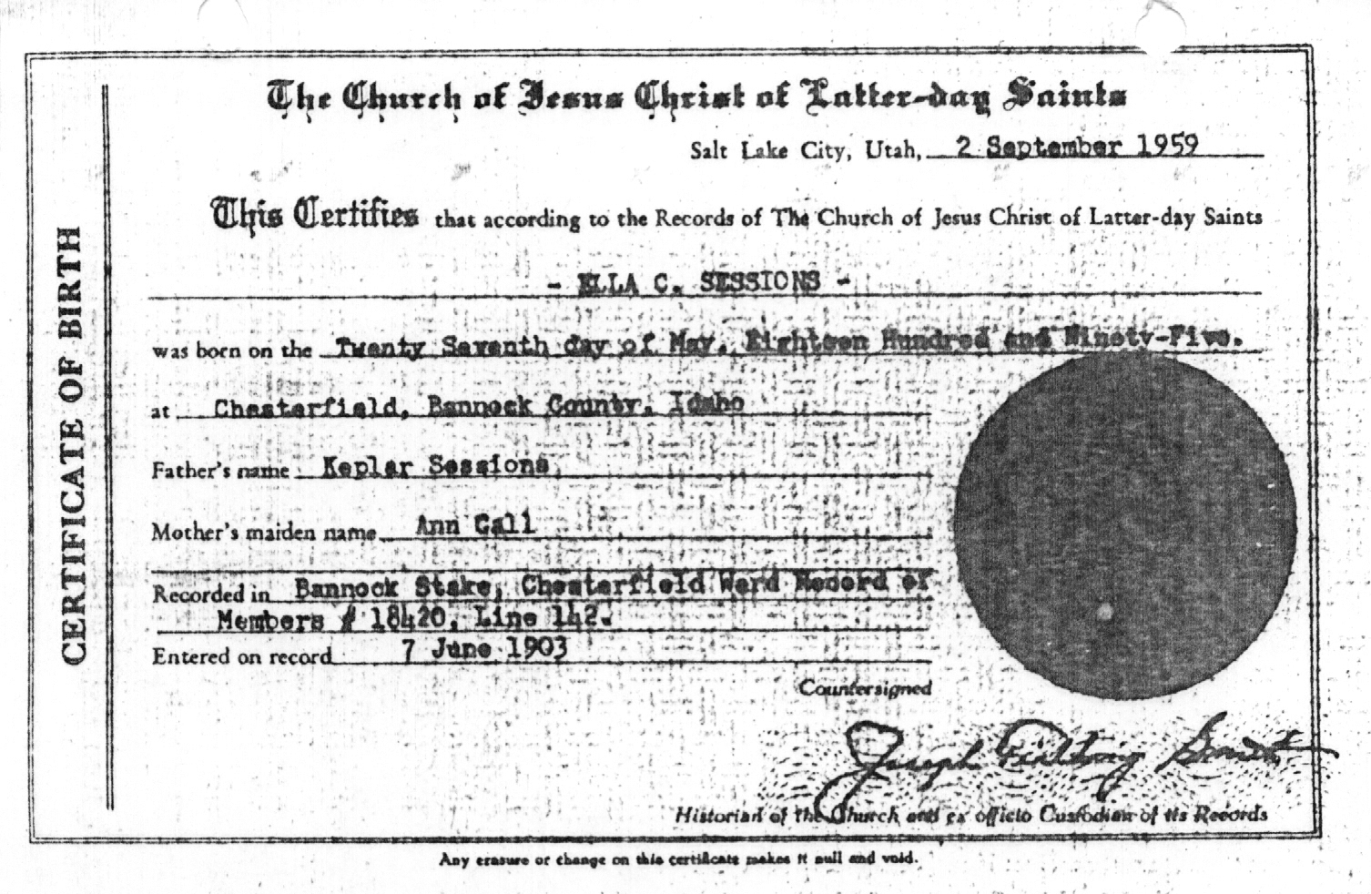 The Life History of Ella Sessions Tolman [also includes life sketch from her funeral] (wife of Fred Tolman). A photo of Ella Tolman. Ella Tolman's Birth Certificate.